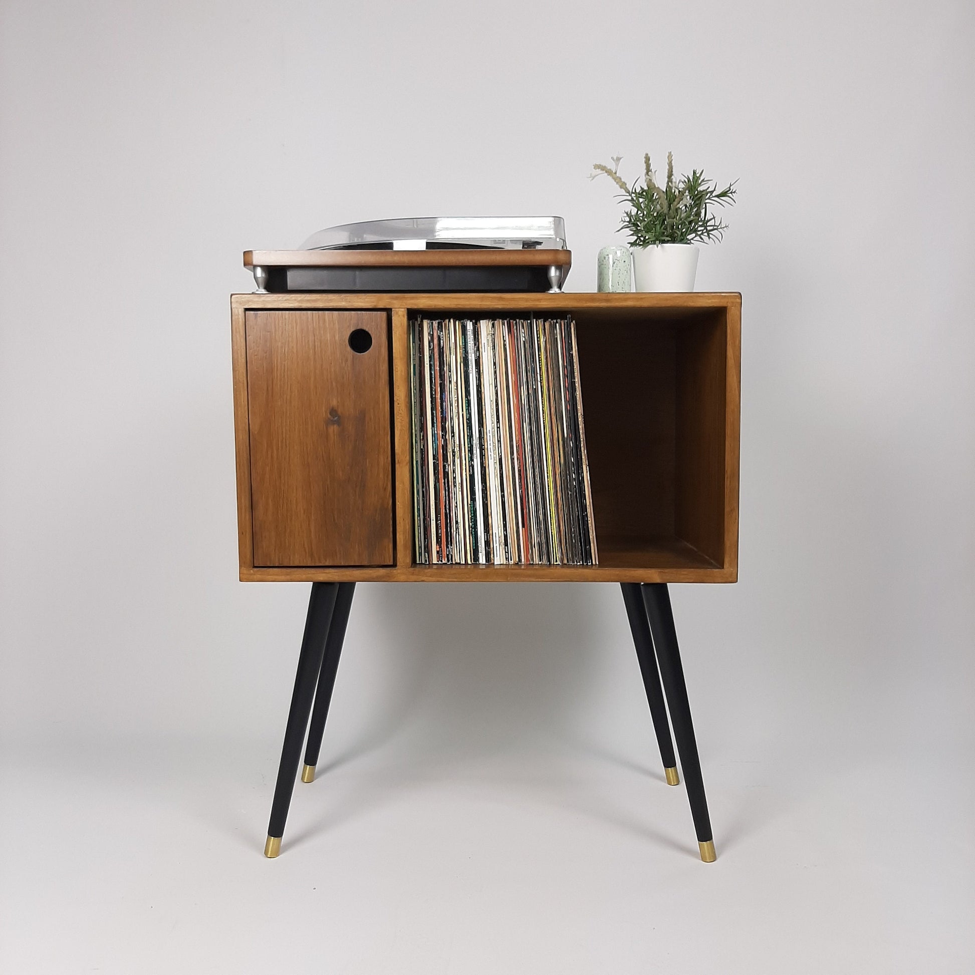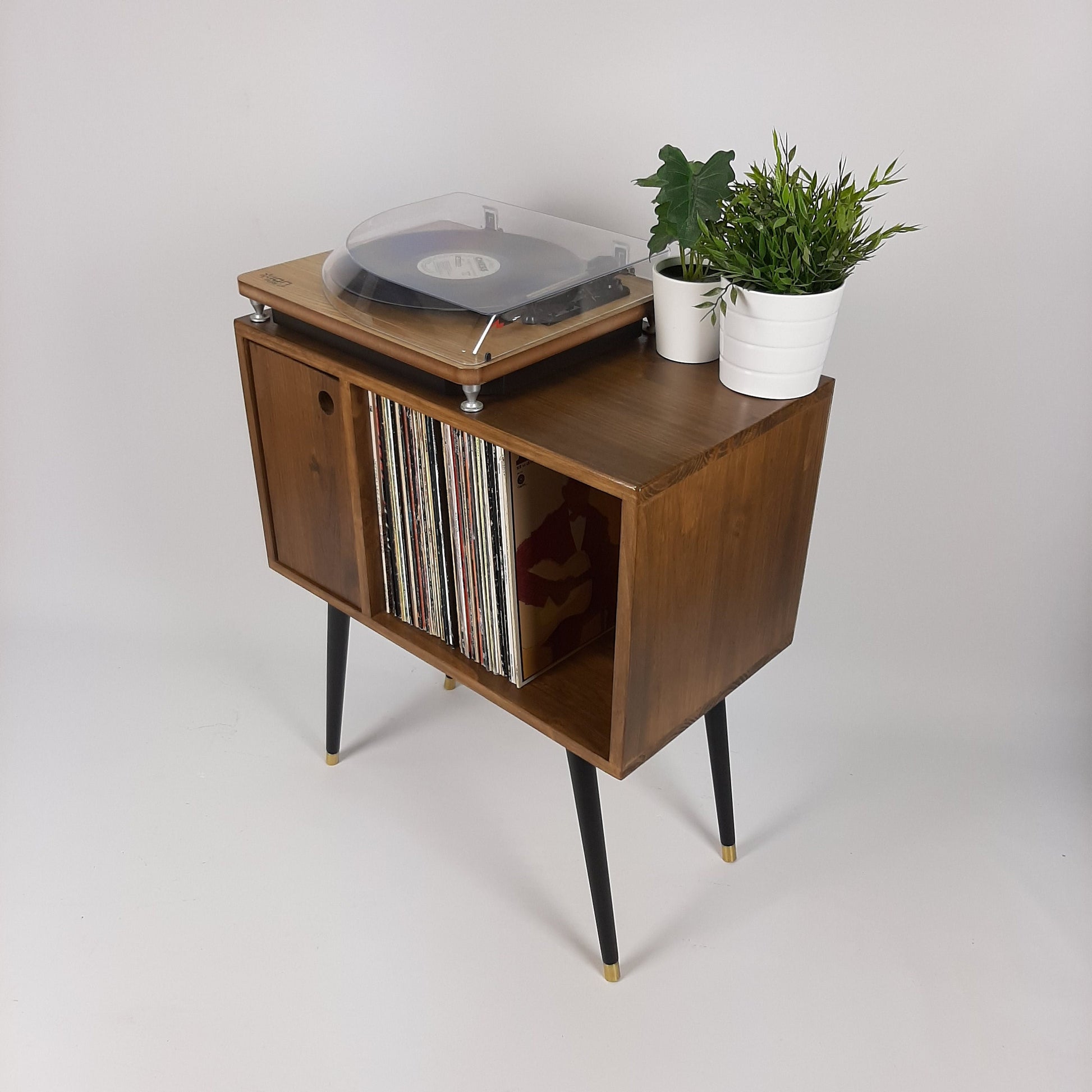 Our stylish, modern walnut side board/media table is designed to hold vinyl records but is also perfect as a living room sideboard, media console or even drinks cabinet. With clean lines it is inspired by mid century Danish minimalist furniture but with a unique modern twist. The legs are handmade dansette style legs made in Santiago, Spain.