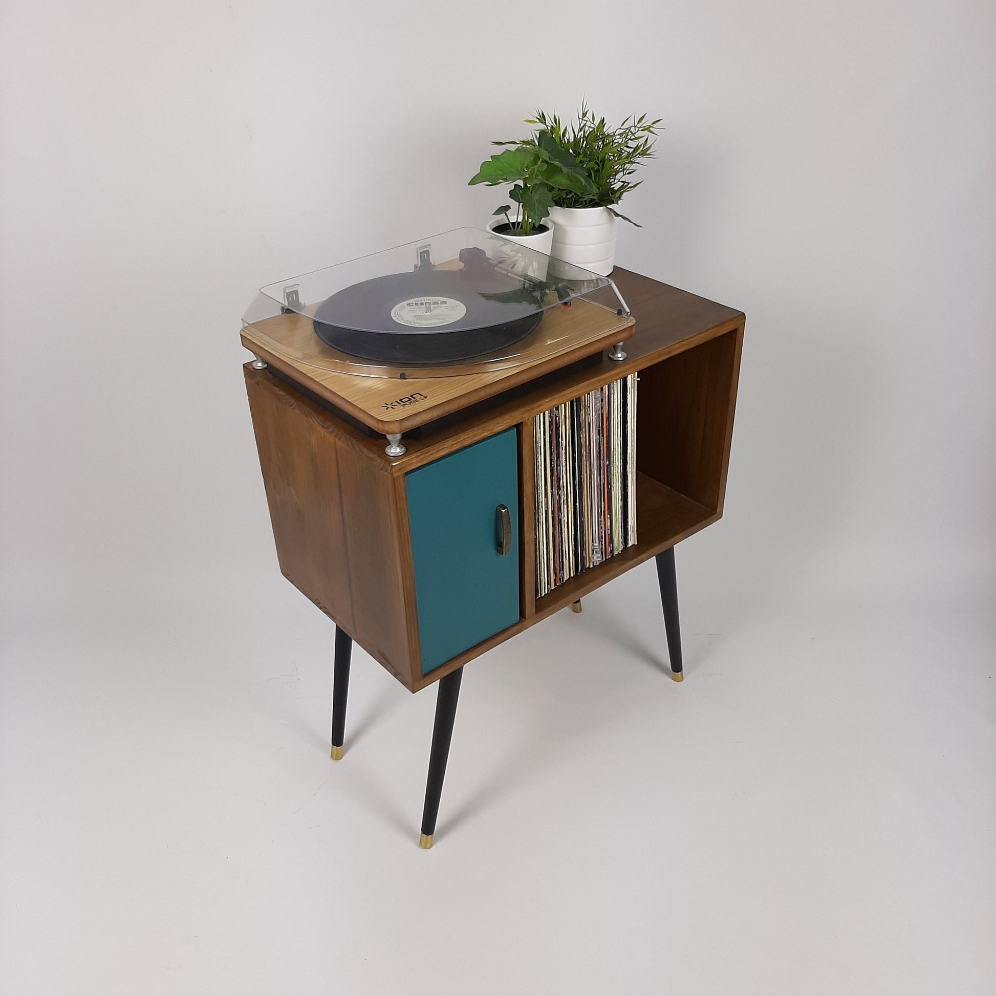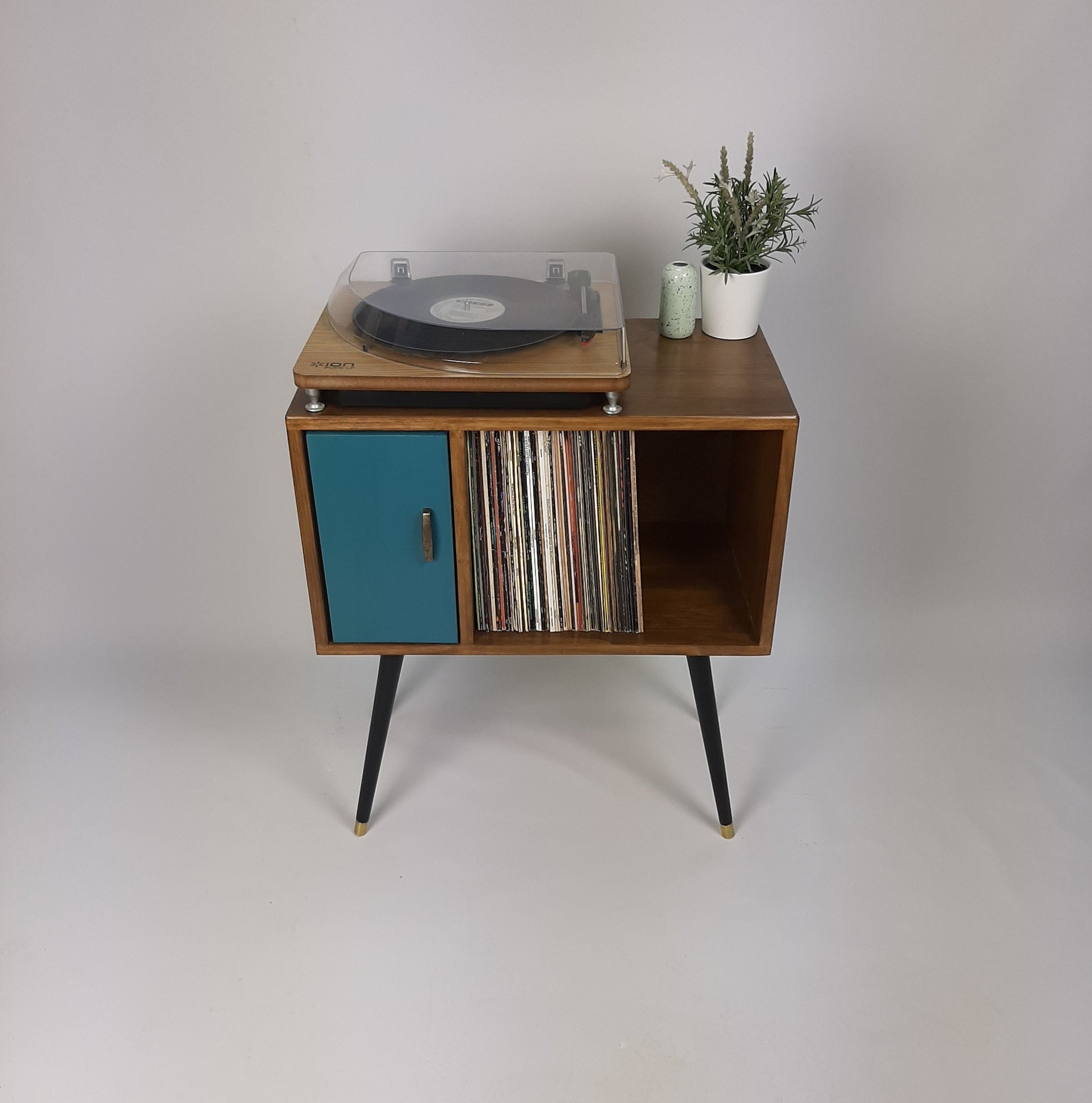 Our stylish, modern walnut side board/media table is designed to hold vinyl records but is also perfect as a living room sideboard, media console or even drinks cabinet. With clean lines it is inspired by mid century Danish minimalist furniture but with a unique modern twist. The legs are handmade dansette style legs made in Santiago, Spain. The royal blue door is solid wood that has been painted, hand sanded and varnished.