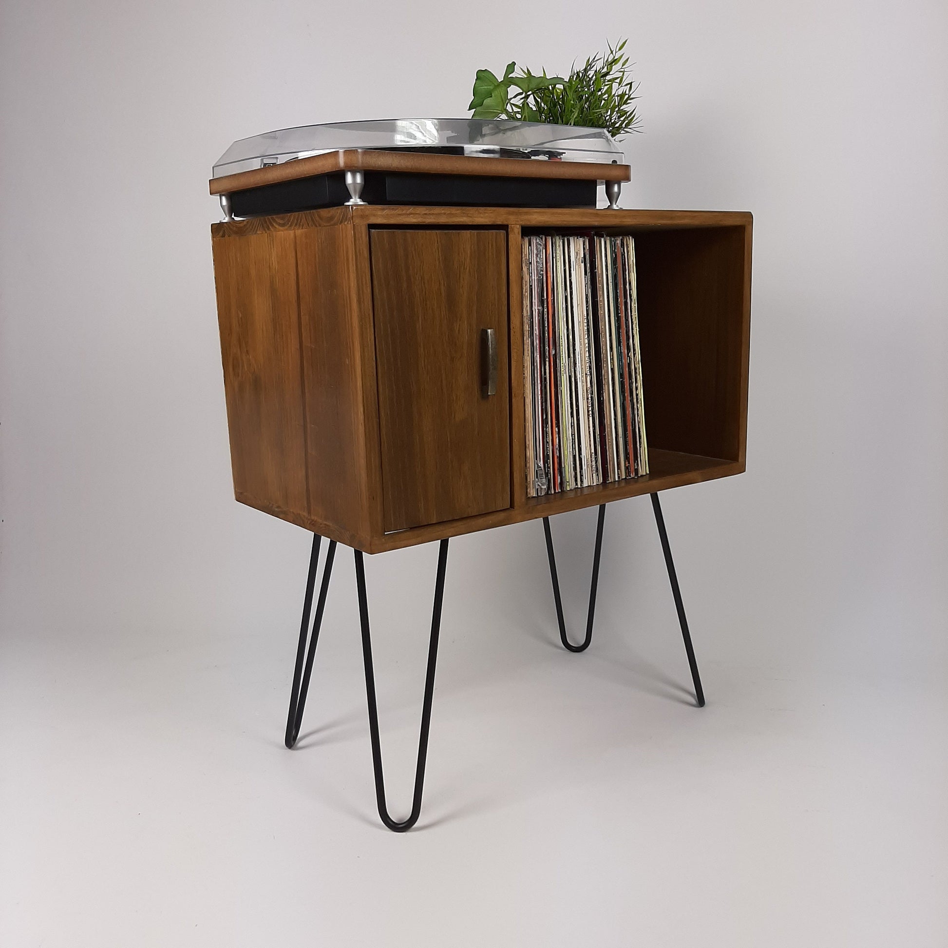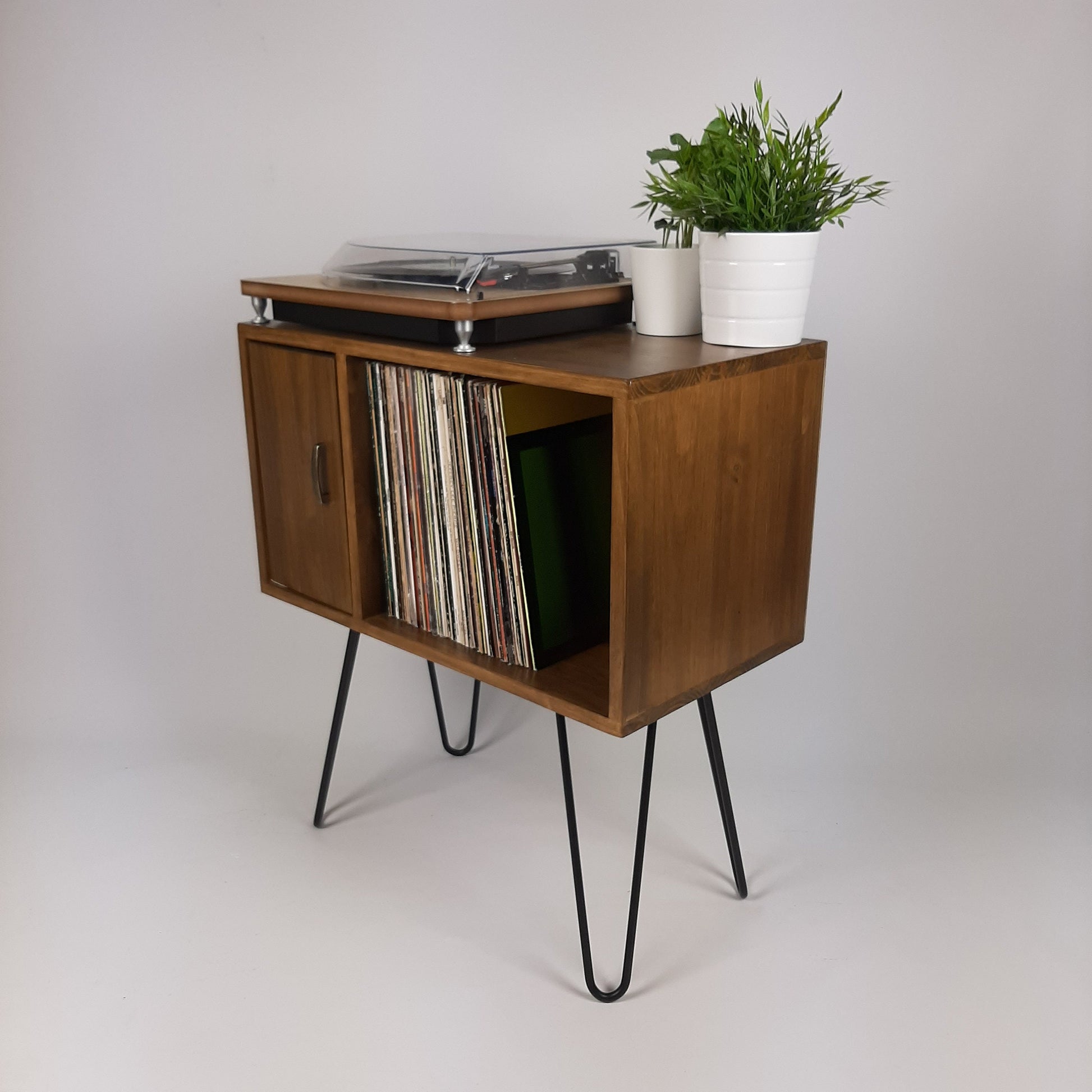 Our stylish, modern walnut side board/media table is designed to hold vinyl records but is also perfect as a living room sideboard, media console or even drinks cabinet. With clean lines it is inspired by mid century Danish minimalist furniture but with a unique modern twist. The hairpin legs are brass coated solid steel made in the UK.