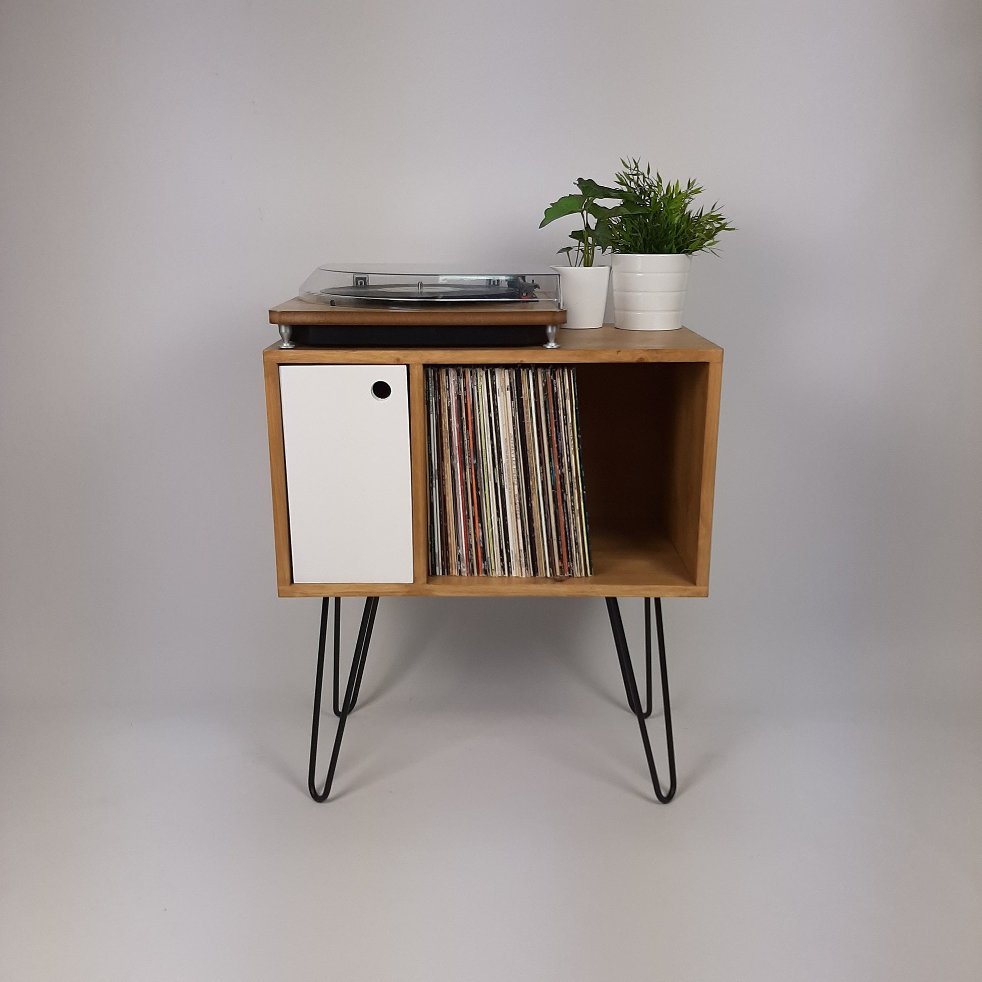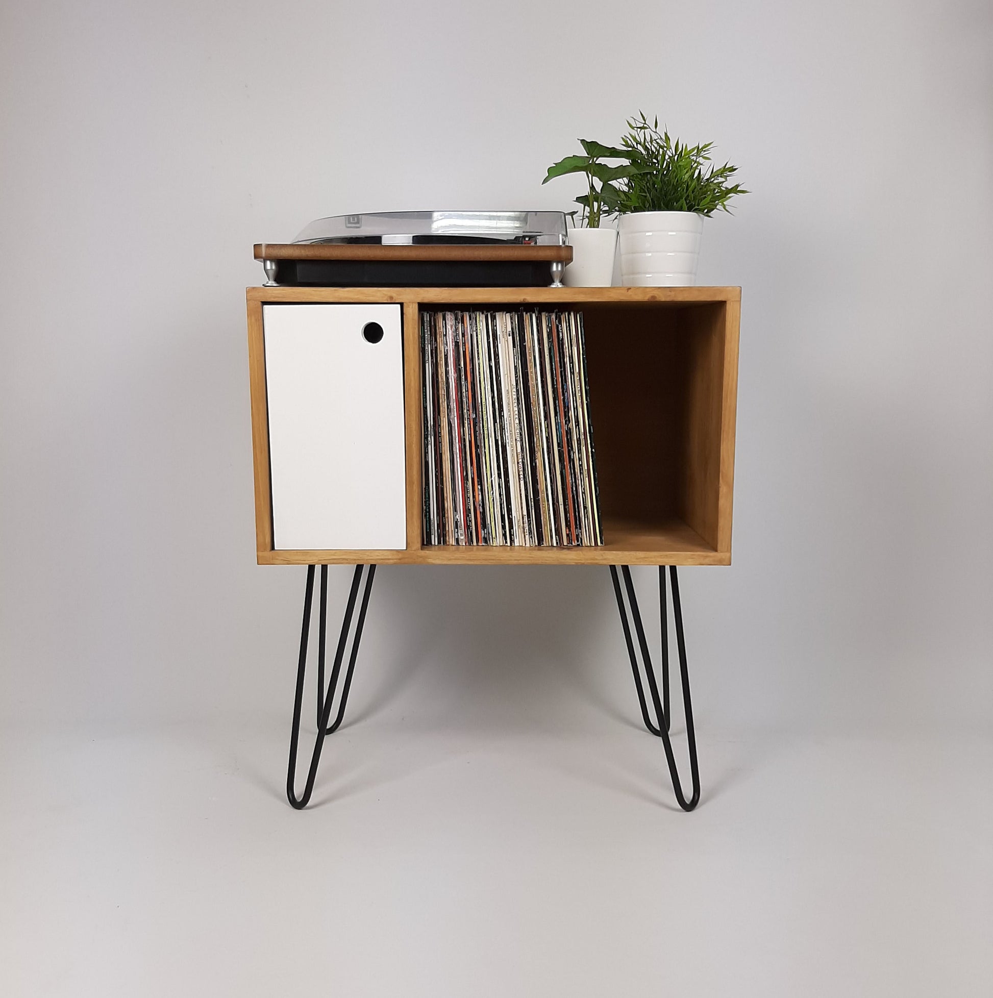 Our stylish, modern side board/media table is designed to hold vinyl records but is also perfect as a living room sideboard, media console or even drinks cabinet. With clean lines it is inspired by mid century Danish minimalist furniture but with a unique modern twist. The hairpin legs are black laquered solid steel made in the UK. The white door is solid wood that has been painted and varnished.