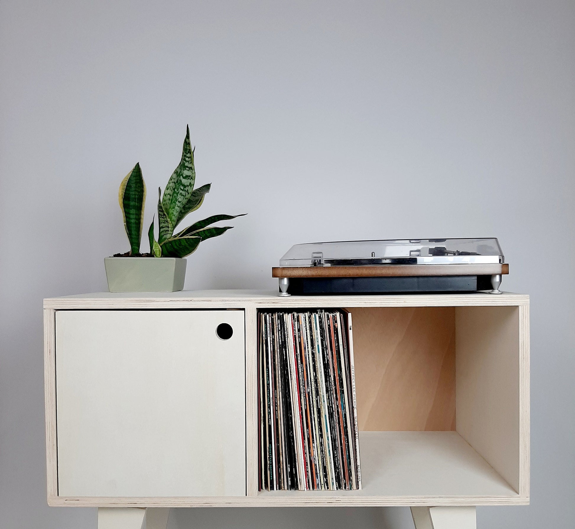 Our stylish, minimalist side board/media table is designed to hold vinyl records but is also perfect as a living room sideboard, media console or even drinks cabinet. With clean lines it is inspired by mid century Danish minimalist furniture but with a unique modern twist. The legs are handmade to a sleek, modern design.