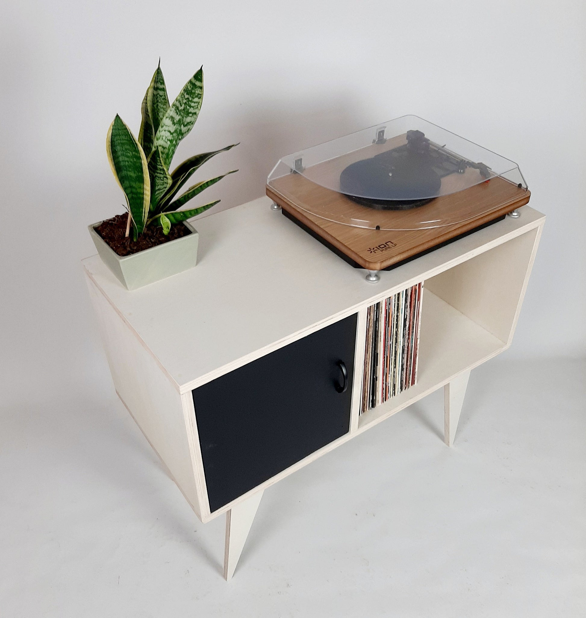 Our stylish, minimalist side board/media table is designed to hold vinyl records but is also perfect as a living room sideboard, media console or even drinks cabinet. With clean lines it is inspired by mid century Danish minimalist furniture but with a unique modern twist. The legs are handmade to a sleek, modern design.