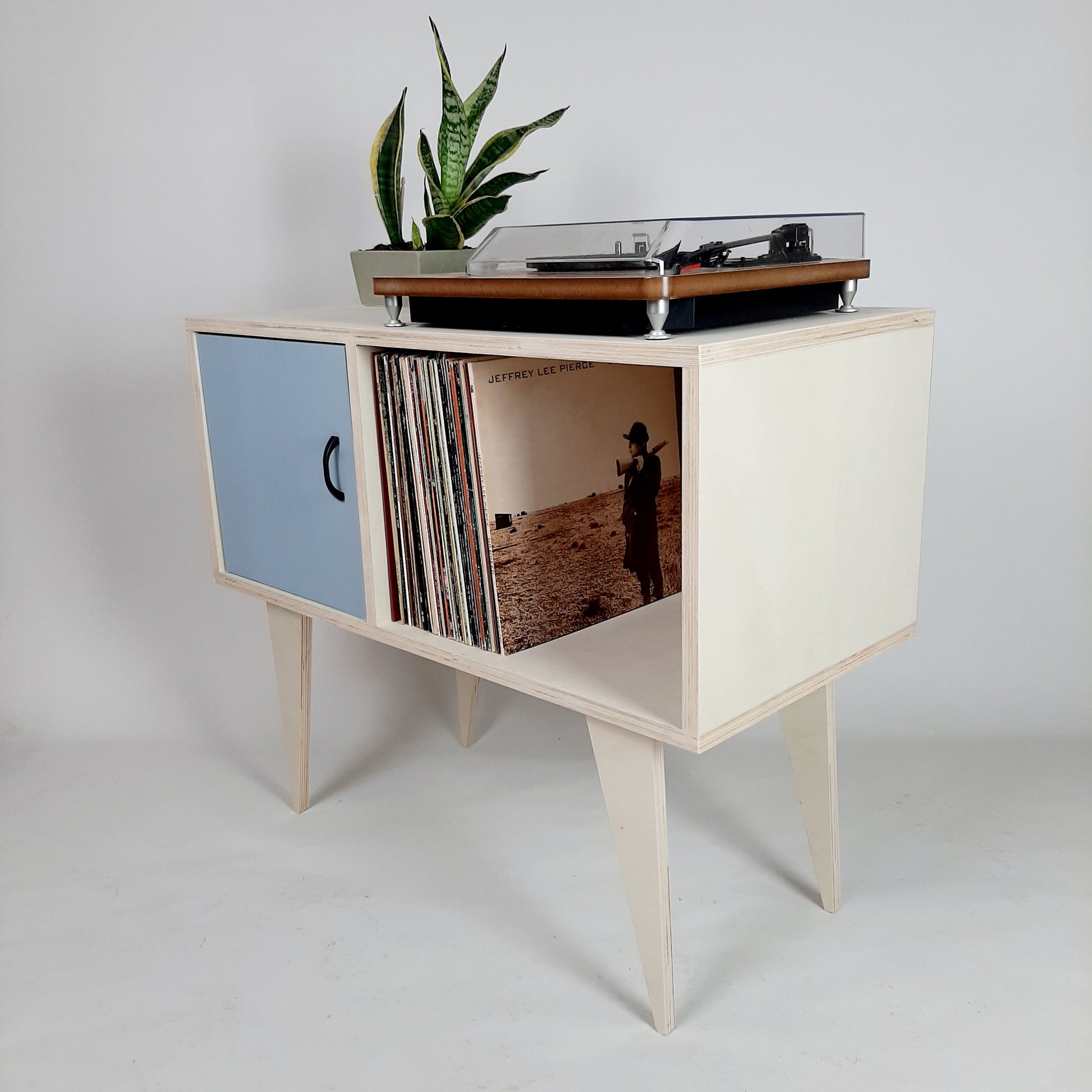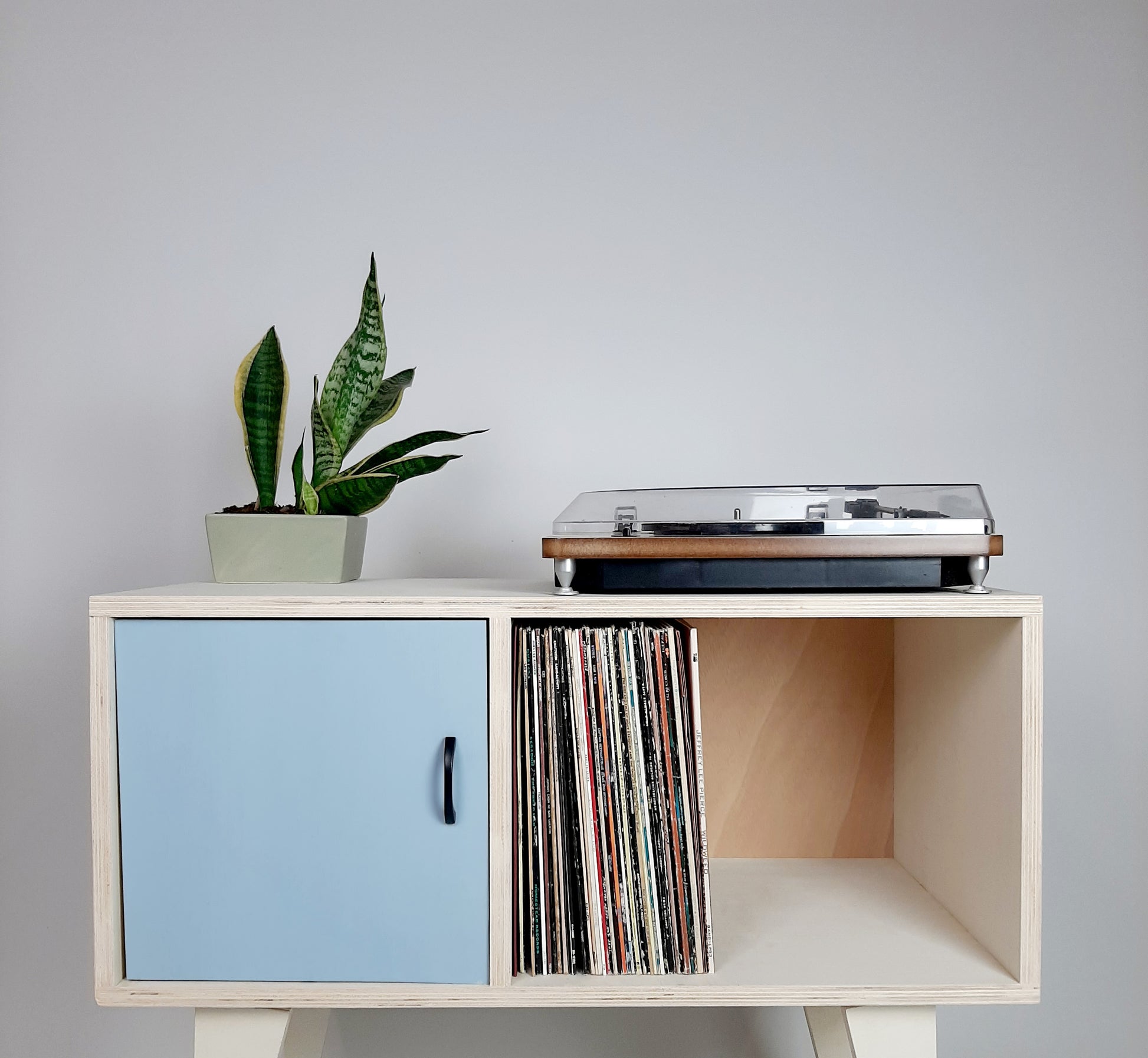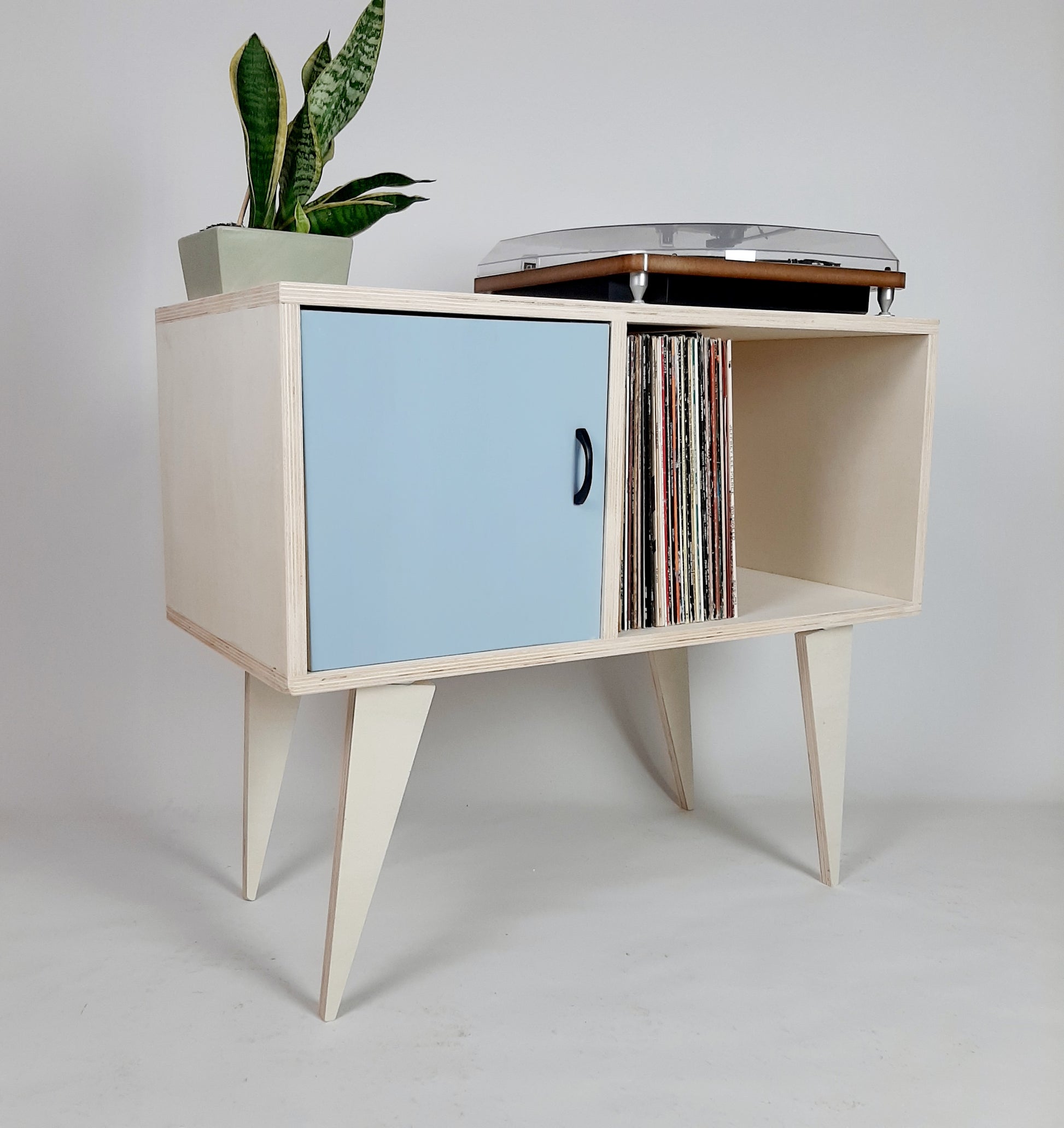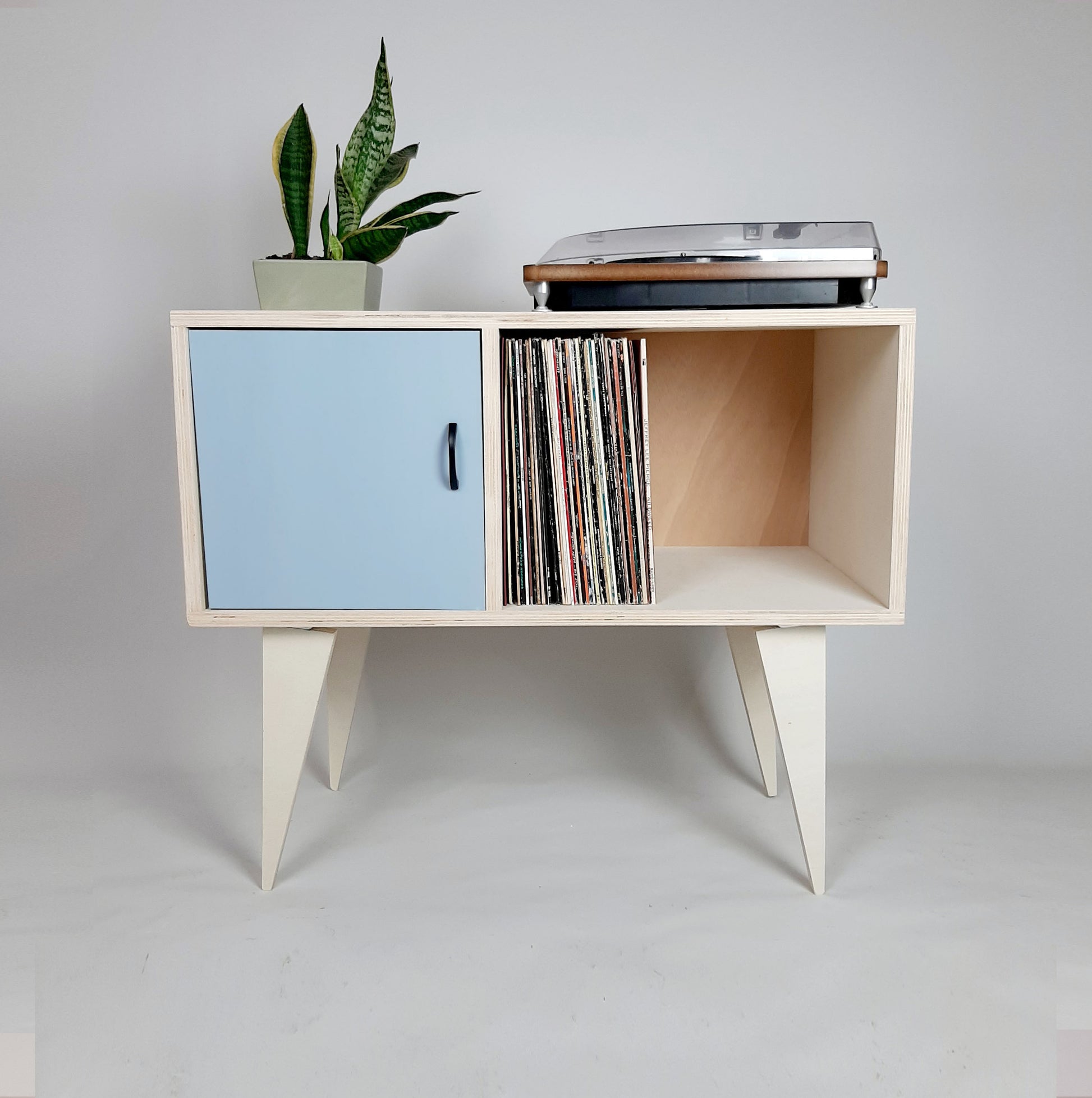 Our stylish, minimalist side board/media table is designed to hold vinyl records but is also perfect as a living room sideboard, media console or even drinks cabinet. With clean lines it is inspired by mid century Danish minimalist furniture but with a unique modern twist. The legs are handmade to a sleek, modern design.