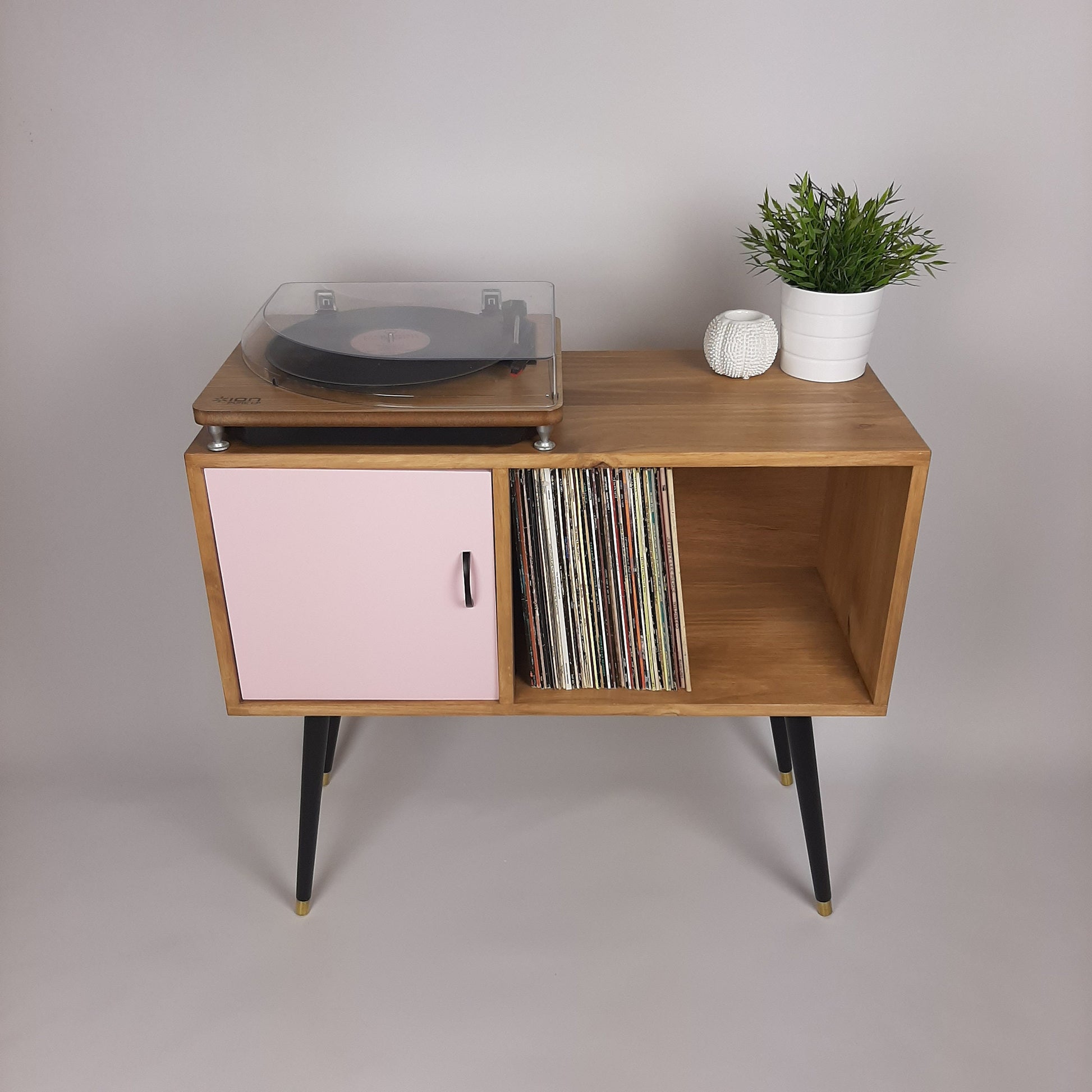 Oak Console Table with Pastel Pink Door and Satin Black Handle | Vinyl Record Storage | Credenza | 100 % Sustainable | Pink