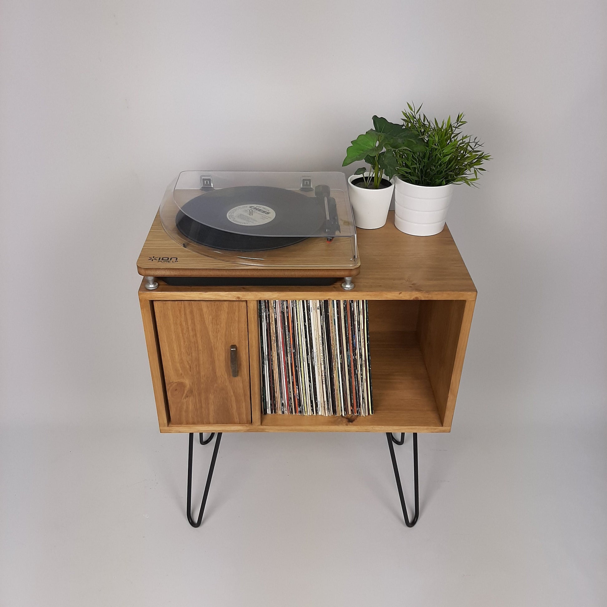 Our stylish, modern side board/media table is designed to hold vinyl records but is also perfect as a living room sideboard, media console or even drinks cabinet. With clean lines it is inspired by mid century Danish minimalist furniture but with a unique modern twist. The hairpin legs are black laquered solid steel made in the UK. The door handle is vintage brass.