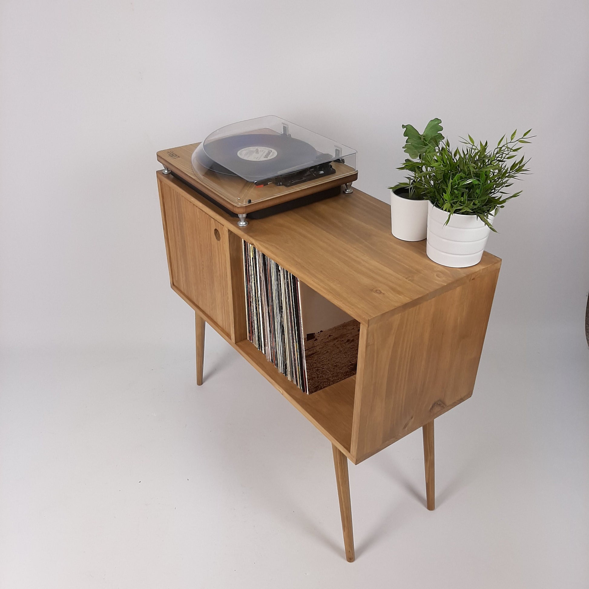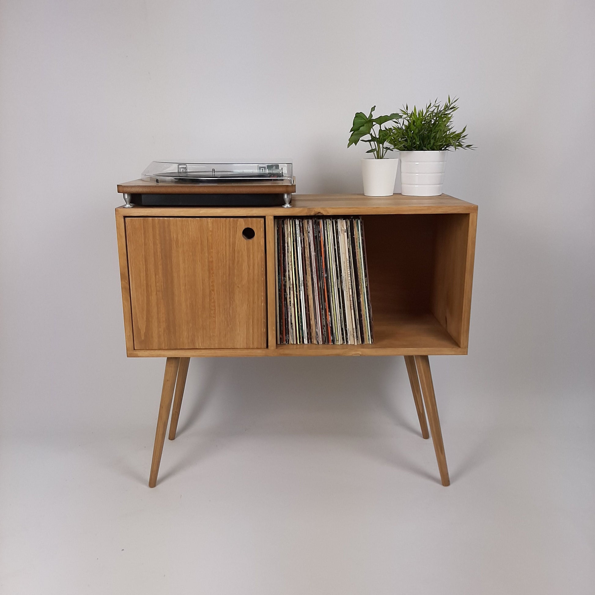 Our stylish, modern oak side board/media table is designed to hold vinyl records but is also perfect as a living room sideboard, media console or even drinks cabinet. With clean lines it is inspired by mid century Danish minimalist furniture but with a unique modern twist. The beautiful, tapered wooden legs are handcrafted in our workshop in Santiago.