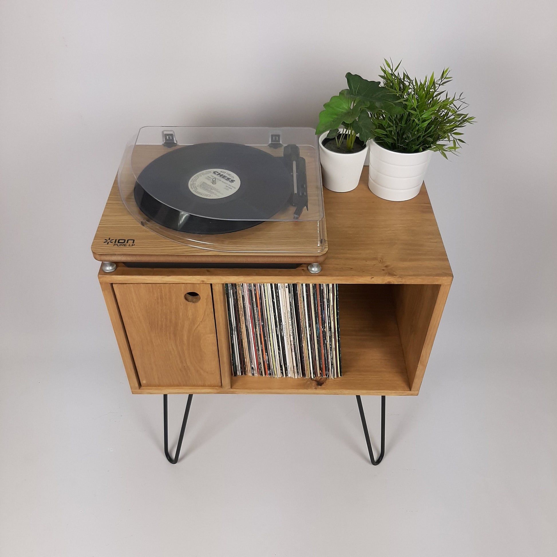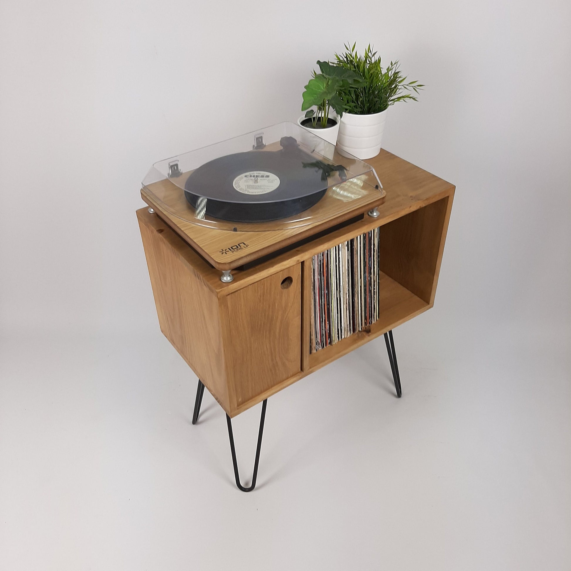 Our stylish, modern side board/media table is designed to hold vinyl records but is also perfect as a living room sideboard, media console or even drinks cabinet. With clean lines it is inspired by mid century Danish minimalist furniture but with a unique modern twist. The hairpin legs are black laquered solid steel made in the UK.