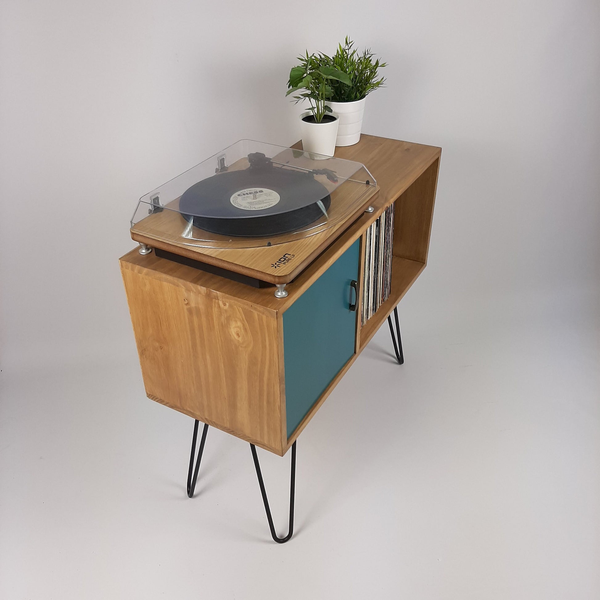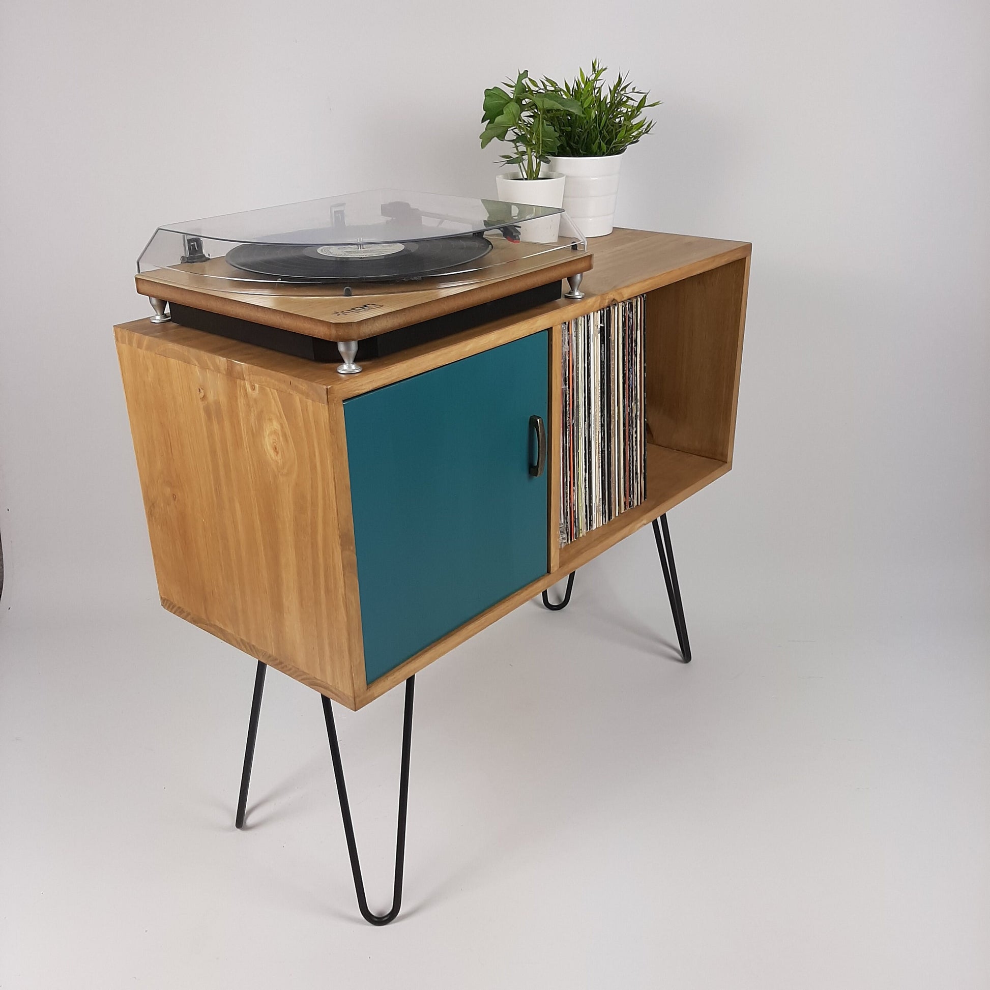 Our stylish, modern side board/media table is designed to hold vinyl records but is also perfect as a living room sideboard, media console or even drinks cabinet. With clean lines it is inspired by mid century Danish minimalist furniture but with a unique modern twist. The hairpin legs are black laquered solid steel made in the UK.