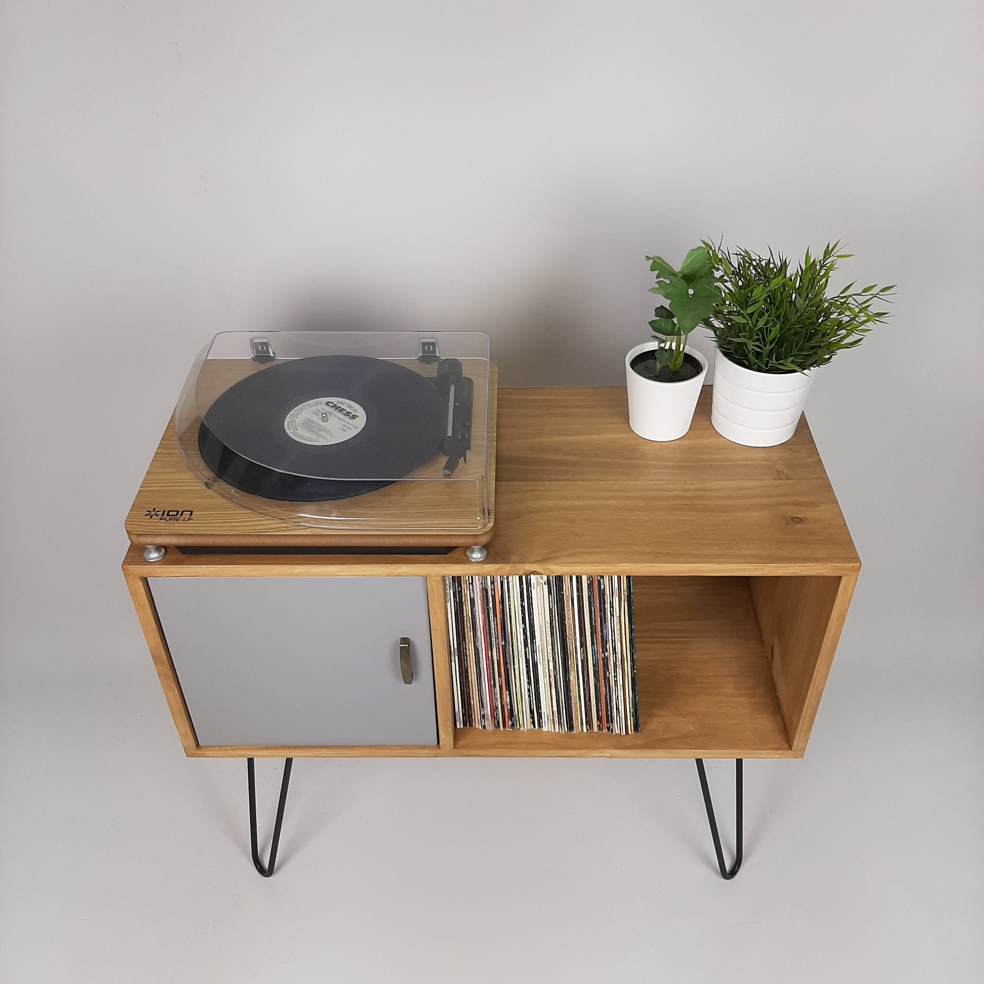 Our stylish, modern side board/media table is designed to hold vinyl records but is also perfect as a living room sideboard, media console or even drinks cabinet. With clean lines it is inspired by mid century Danish minimalist furniture but with a unique modern twist. The hairpin legs are black laquered solid steel made in the UK.