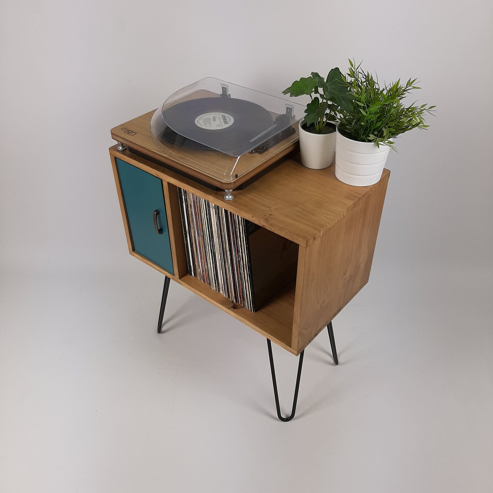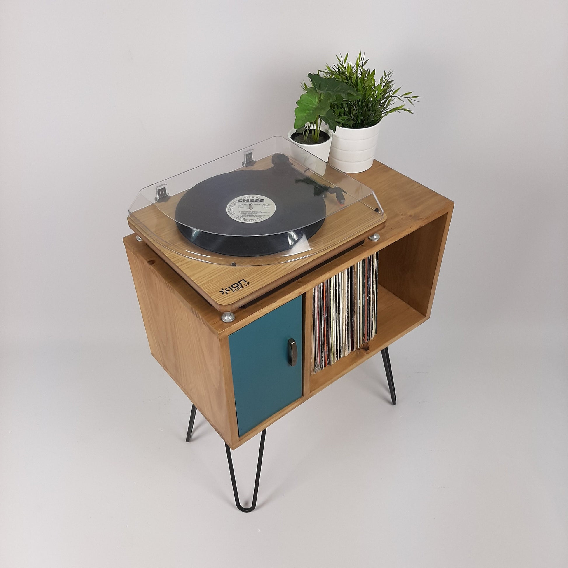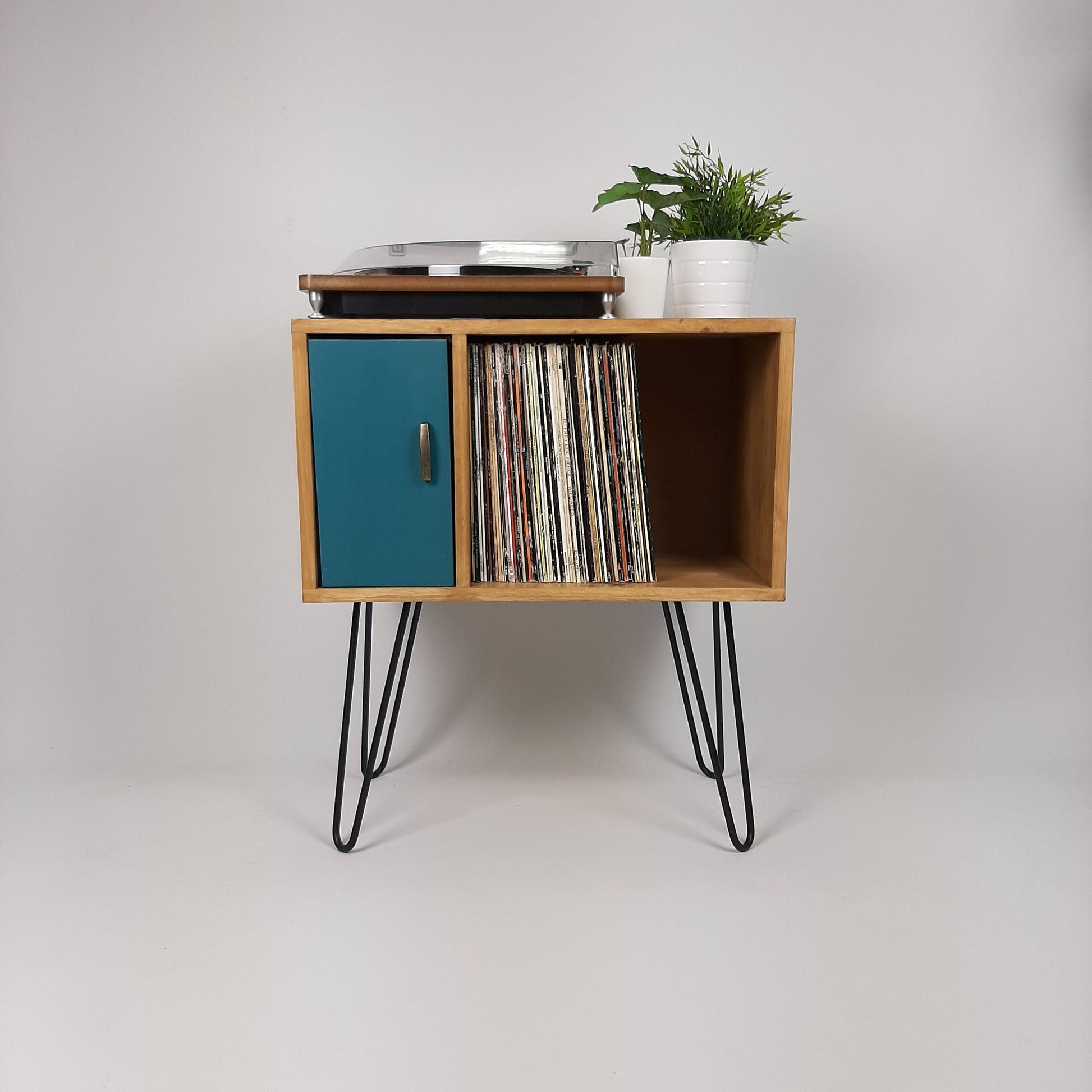 Our stylish, modern side board/media table is designed to hold vinyl records but is also perfect as a living room sideboard, media console or even drinks cabinet. With clean lines it is inspired by mid century Danish minimalist furniture but with a unique modern twist. The hairpin legs are brass coated solid steel made in the UK. The royal blue door is hand-painted and varnished.