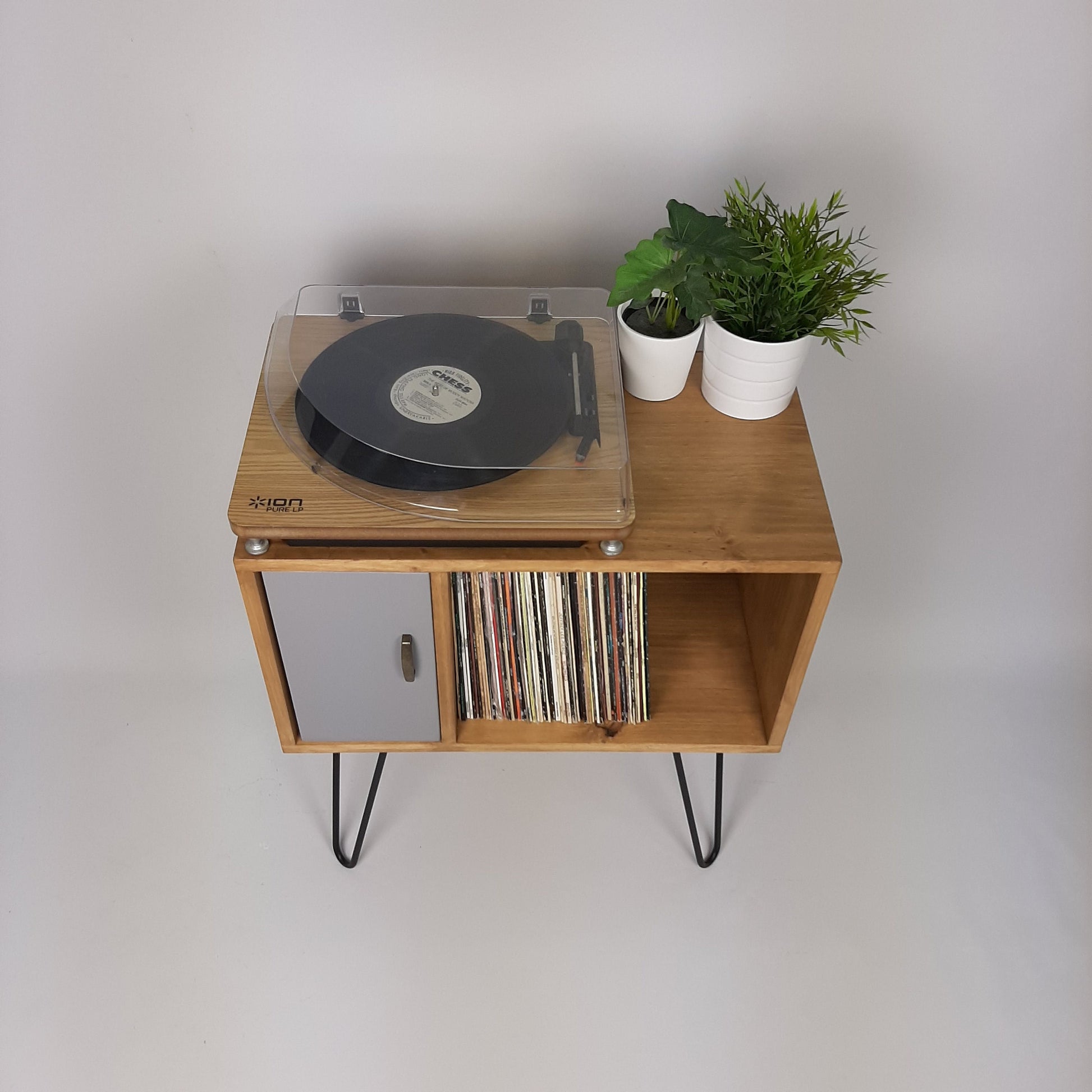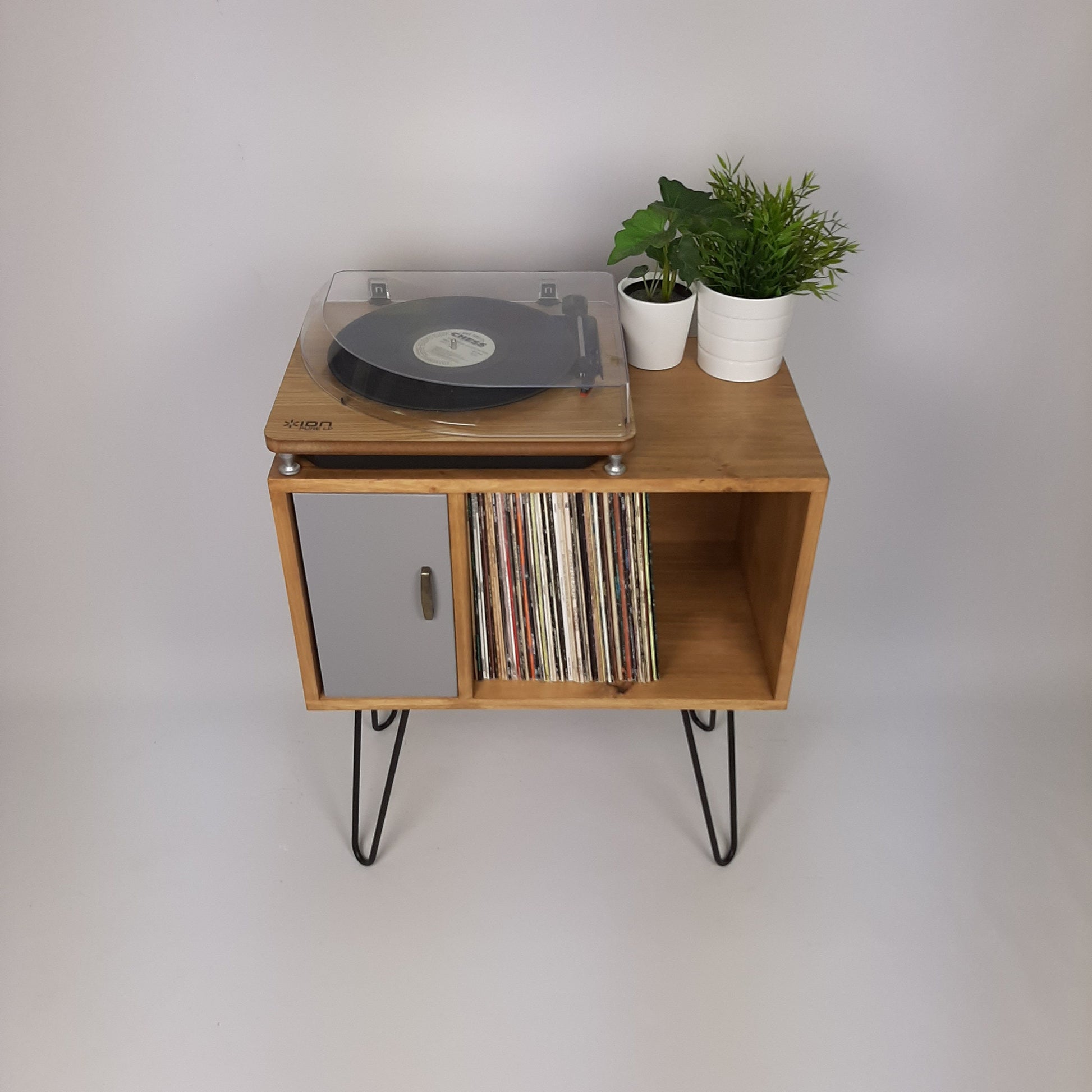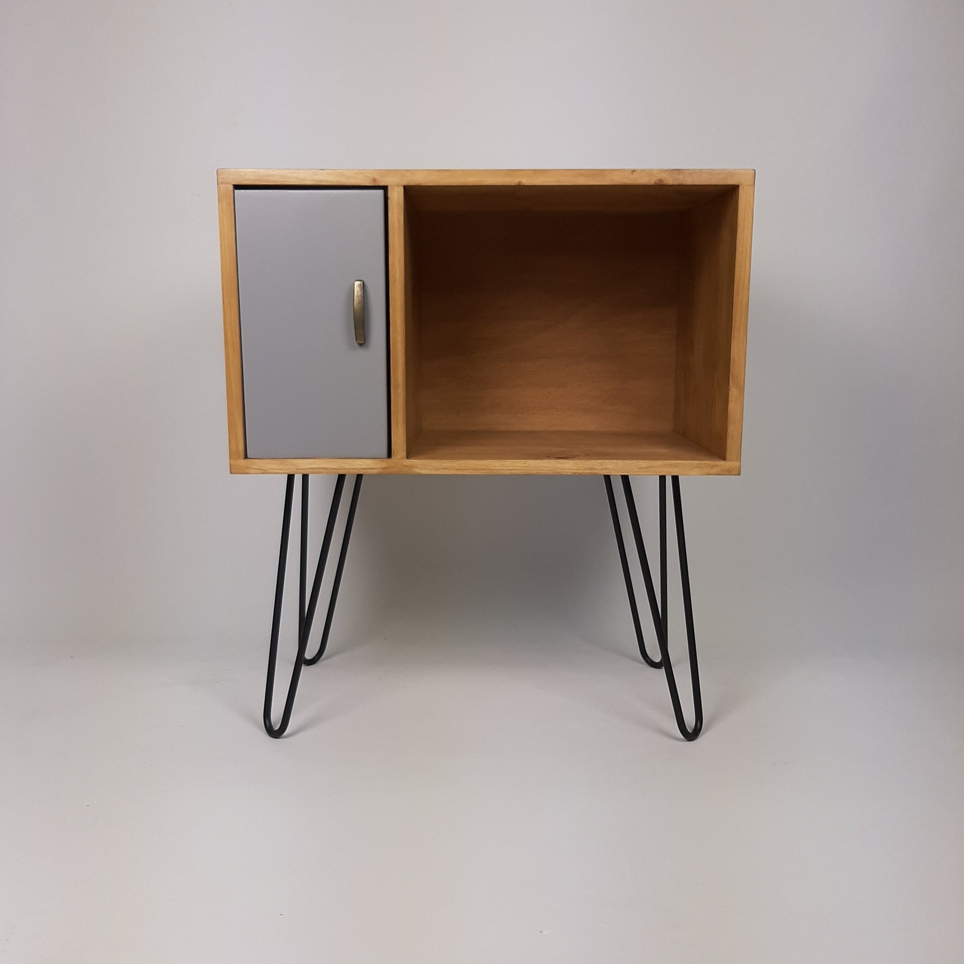 Our stylish, modern side board/media table is designed to hold vinyl records but is also perfect as a living room sideboard, media console or even drinks cabinet. With clean lines it is inspired by mid century Danish minimalist furniture but with a unique modern twist. The hairpin legs are brass coated solid steel made in the UK. The pearl grey door is hand-painted and varnished.