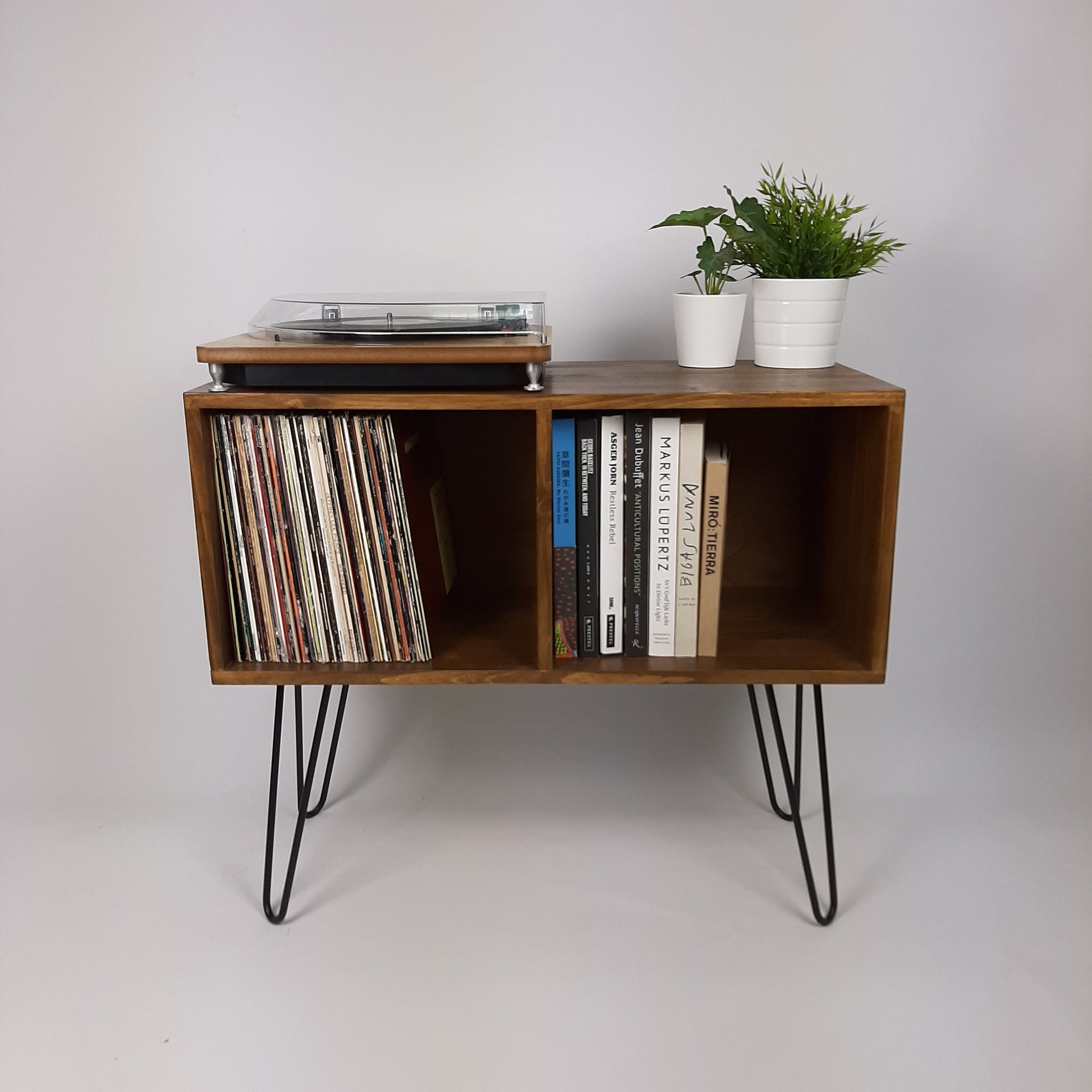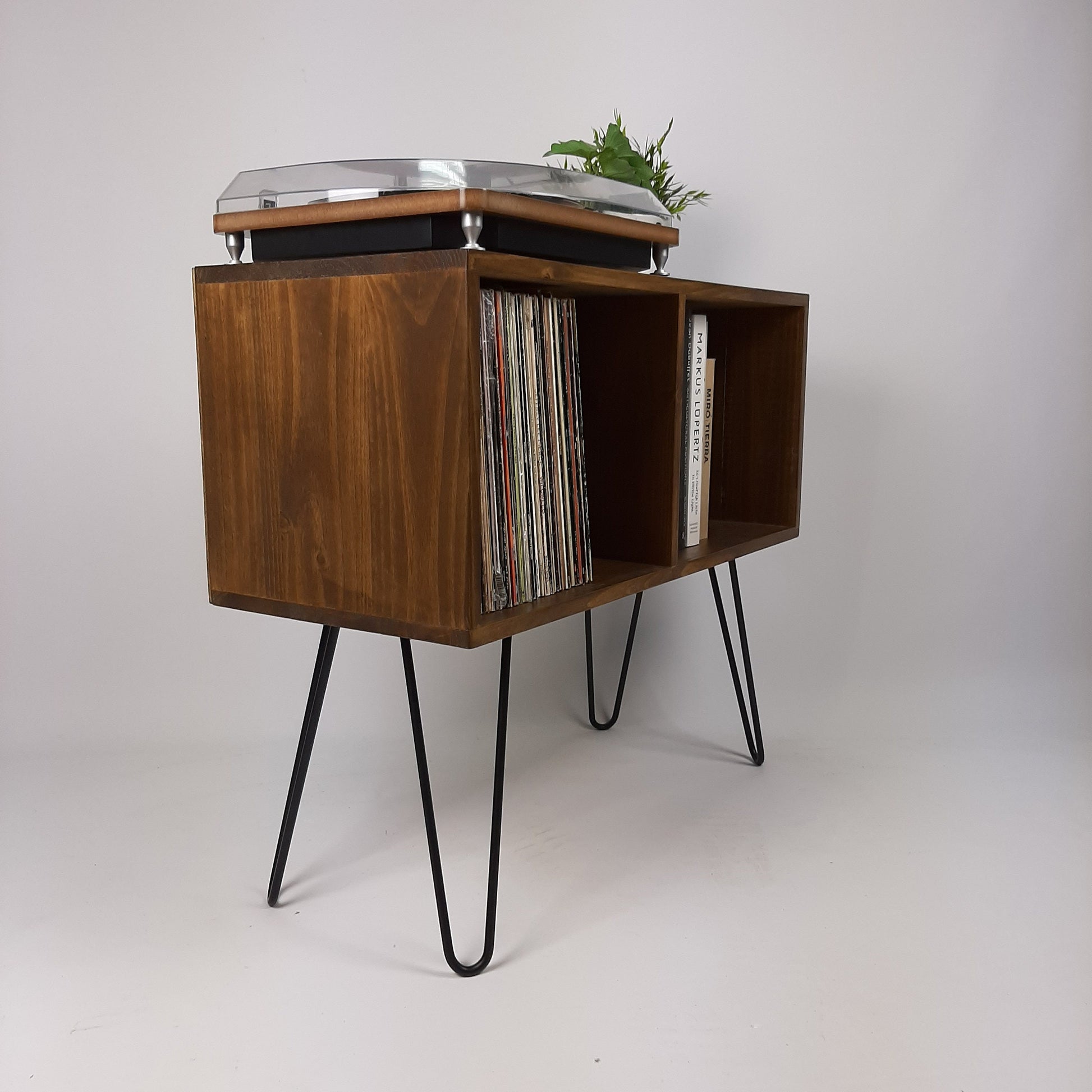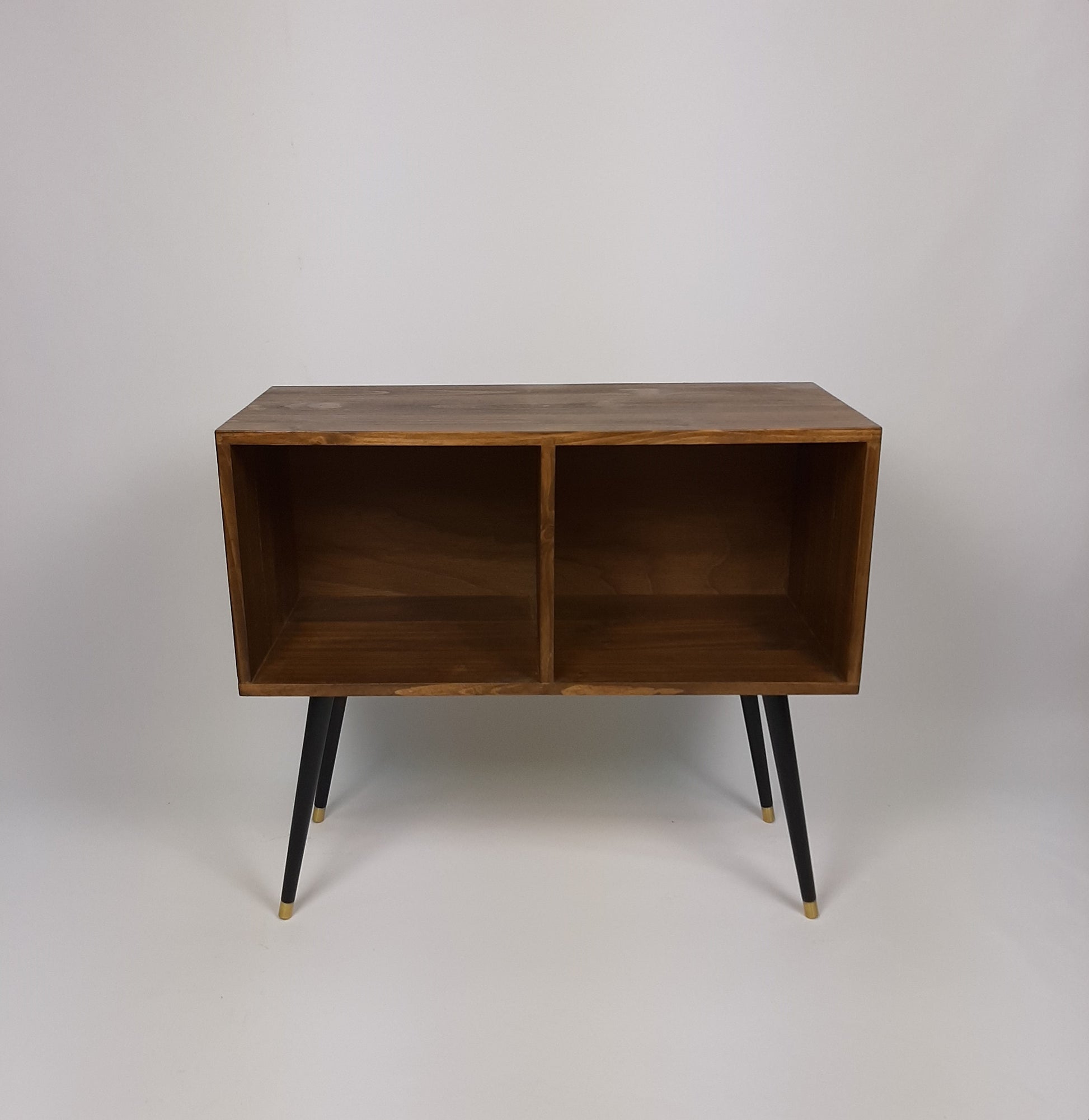 Our stylish, modern walnut side board/media table is designed to hold vinyl records but is also perfect as a living room sideboard, media console or even drinks cabinet. With clean lines it is inspired by mid century Danish minimalist furniture but with a unique modern twist. The legs are dansette style legs handmade here in Santiago, Spain.