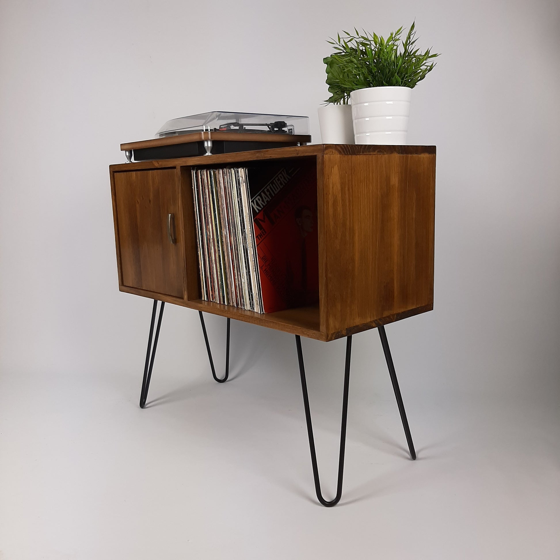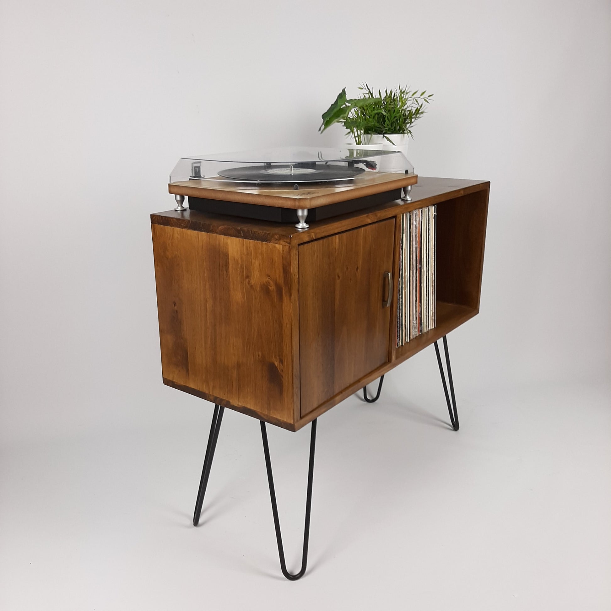 Our stylish, modern walnut side board/media table is designed to hold vinyl records but is also perfect as a living room sideboard, media console or even drinks cabinet. With clean lines it is inspired by mid century Danish minimalist furniture but with a unique modern twist. The hairpin legs are black laquered solid steel made in the UK. The handle is vintage brass.