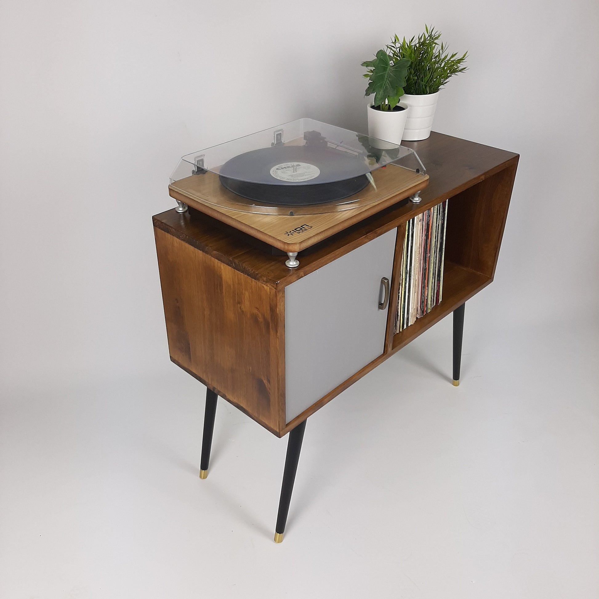 Our stylish, modern walnut side board/media table is designed to hold vinyl records but is also perfect as a living room sideboard, media console or even drinks cabinet. With clean lines it is inspired by mid century Danish minimalist furniture but with a unique modern twist. The legs are dansette style legs handmade here in Santiago de Compostella. The pearl grey door is solid wood that has been painted and varnished. The handle is vintage brass.