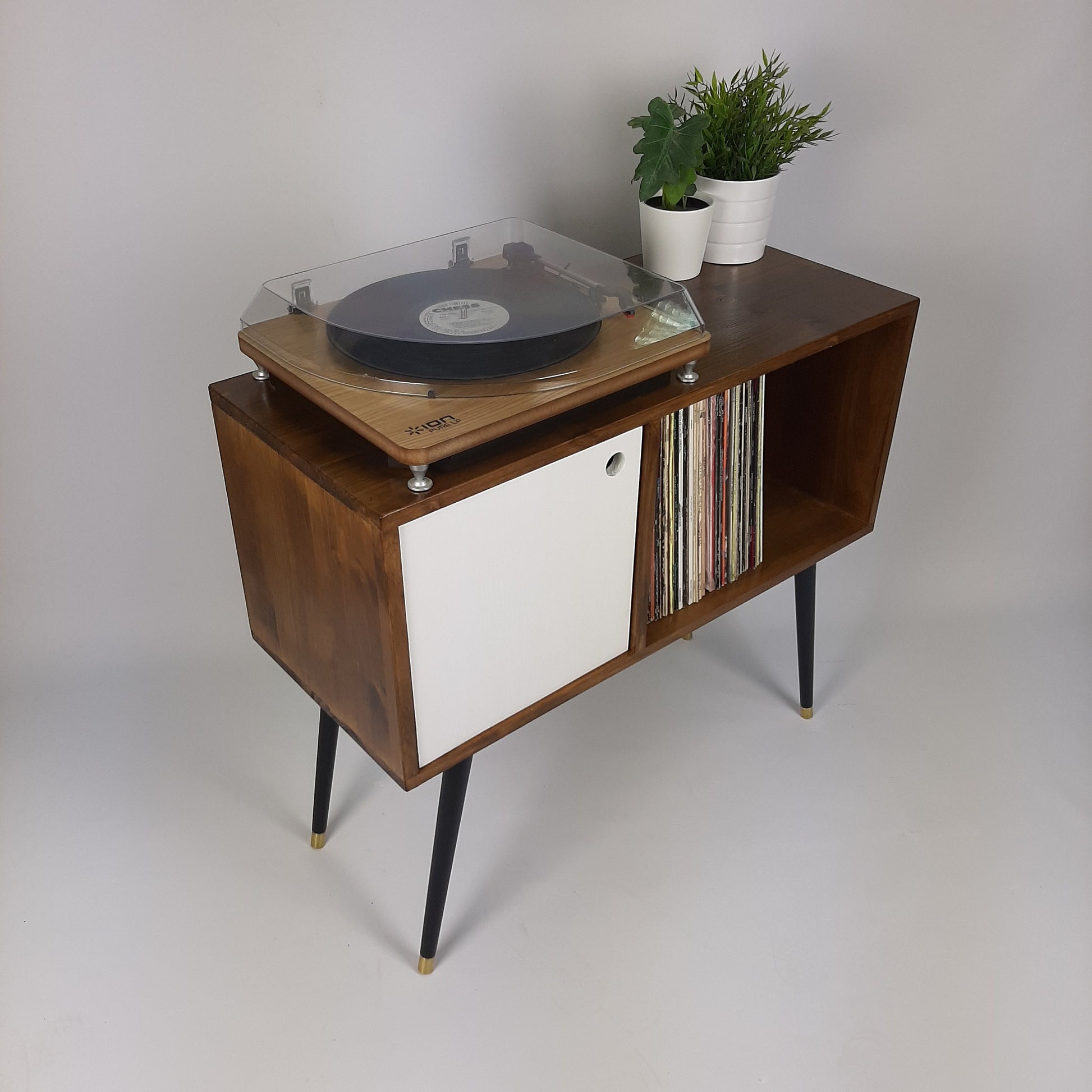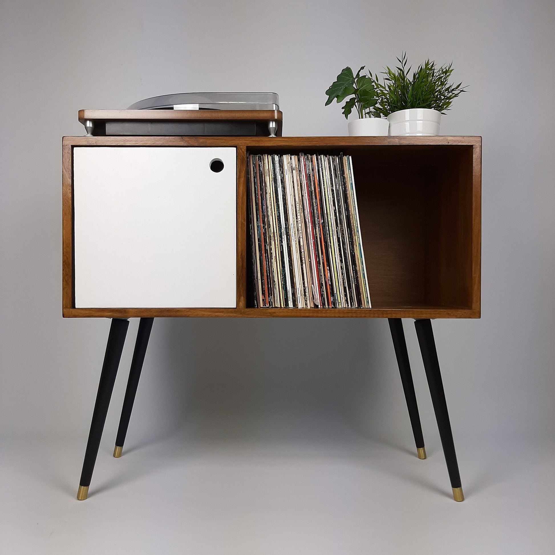 Our stylish, modern walnut side board/media table is designed to hold vinyl records but is also perfect as a living room sideboard, media console or even drinks cabinet. With clean lines it is inspired by mid century Danish minimalist furniture but with a unique modern twist. The legs are dansette style legs handmade here in Santiago, Spain The white door is solid wood that has been painted and varnished.