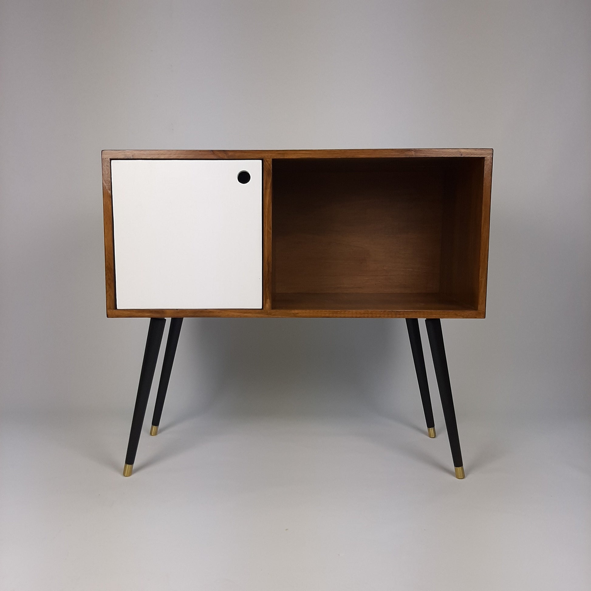 Walnut Sideboard with White Door, Brass Tipped Black Legs | Vinyl Record Storage | Mid Century Modern Table | Media Console